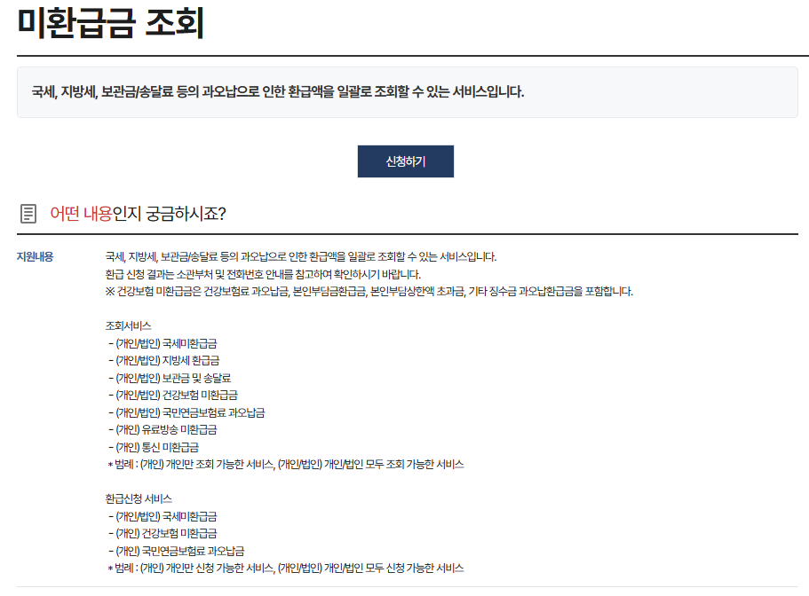 정부24(www.gov.kr)는 국세뿐 아니라 지방세, 건강보험, 국민연금, 고용보험 등 각종 공공기관의 미환급금을 한 번에 조회할 수 있는 서비스도 제공합니다.