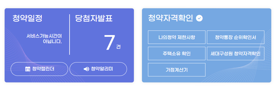| 주요 서비스 | 청약신청, 공고조회, 당첨조회, 자격확인, 가점계산 |