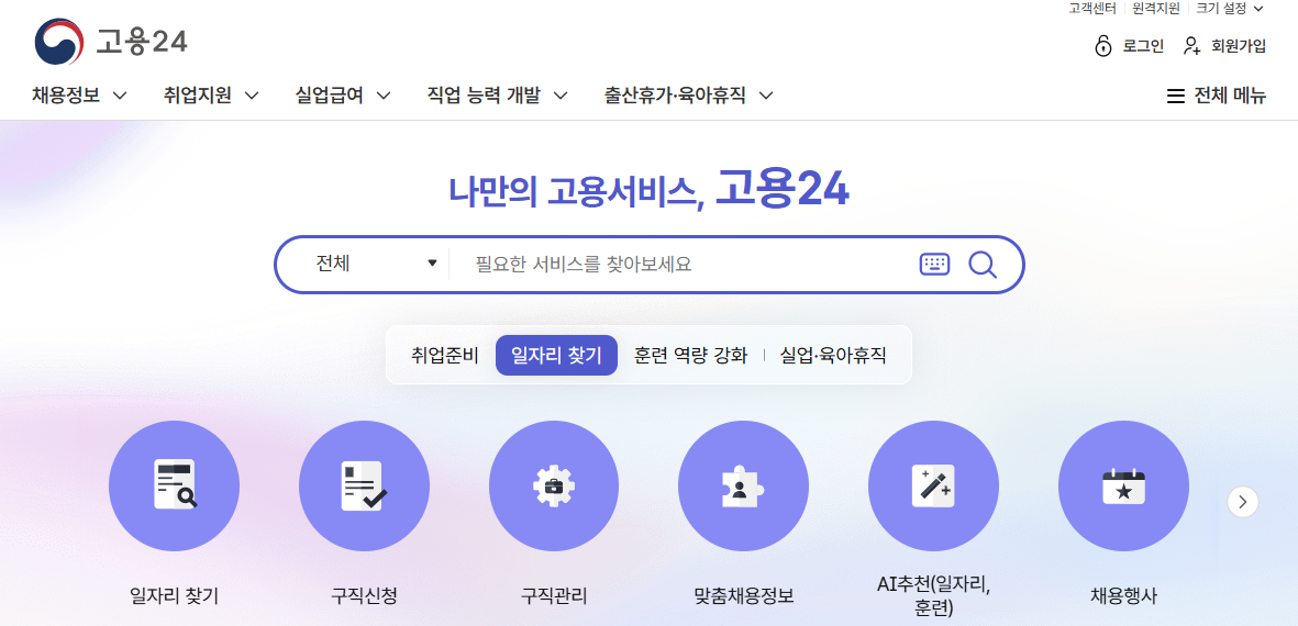 홈페이지를 제대로 이용하려면 먼저 회원가입과 로그인 과정을 거쳐야 합니다. 비회원 상태에서는 일부 메뉴(훈련과정 검색, 제도 안내 등)만 볼 수 있고, 수강신청이나 내일배움카드 신청은 불가능합니다.