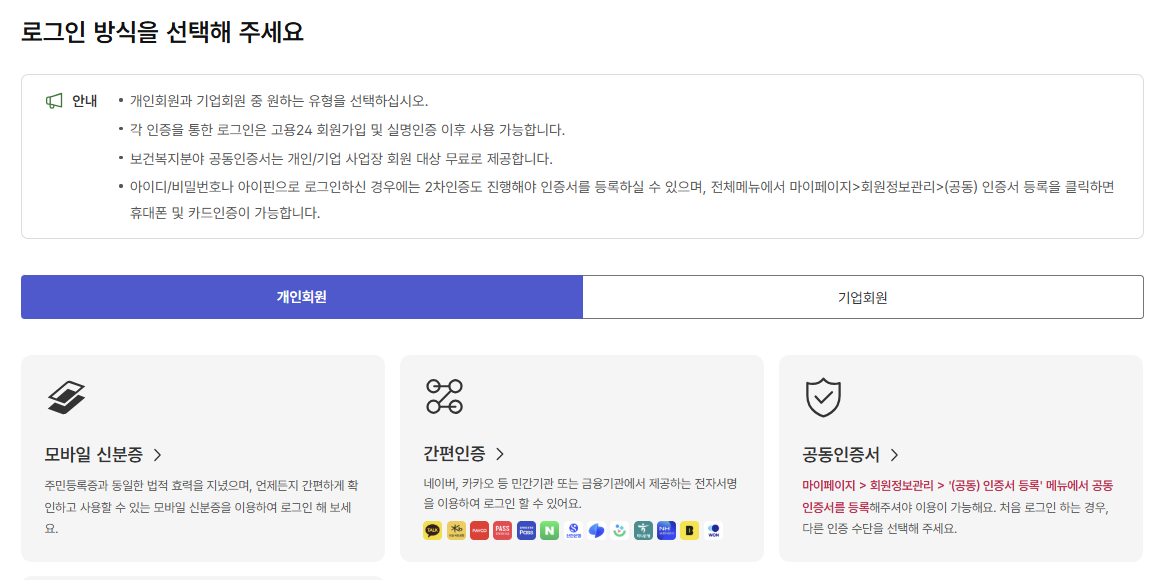 - 공동인증서, 금융인증서, 간편인증(PASS·카카오 등) 중 원하는 방식을 선택합니다.