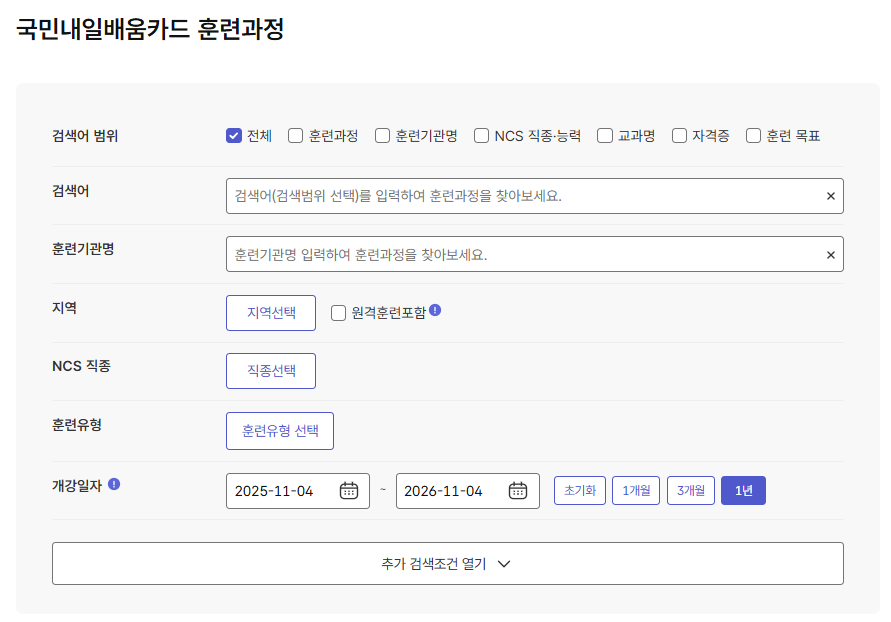 - 직종(IT, 디자인, 회계, 제조 등), 지역, 훈련유형(국기, 일반, 사업주 등), 훈련시간 등을 설정하여 검색합니다.