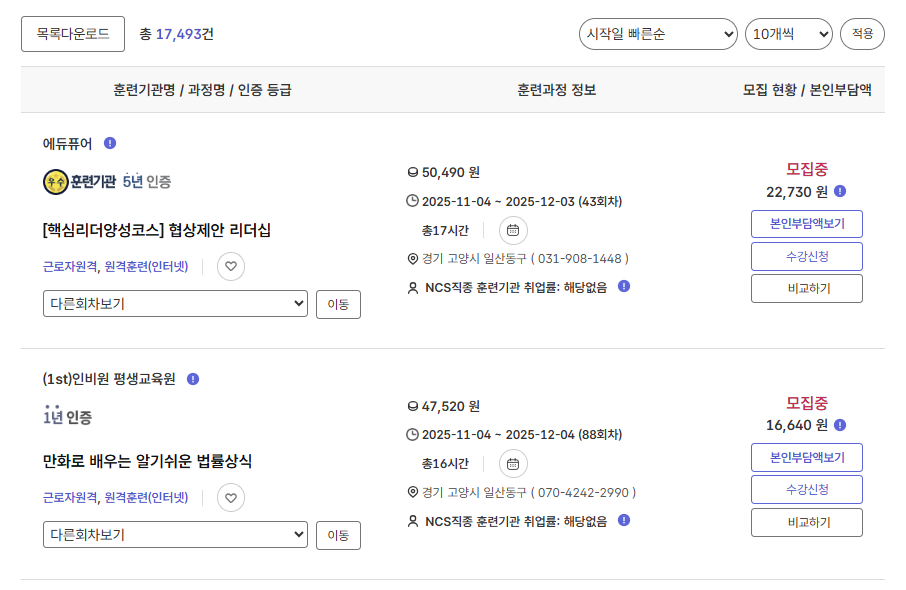 - 각 과정별로 훈련기관명, 수강기간, 훈련비, 지원율, 수강평 등을 확인할 수 있습니다.