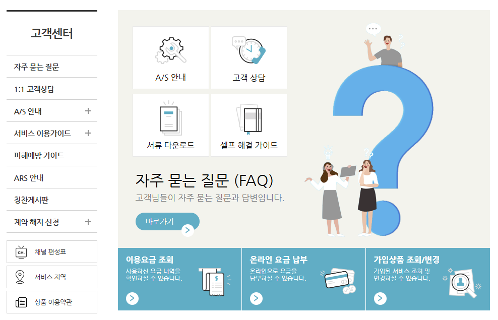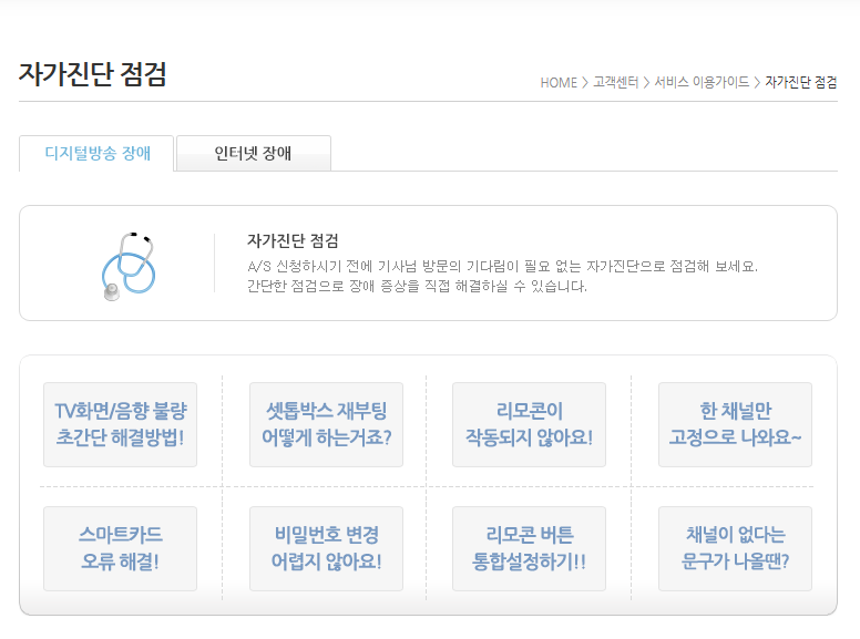 홈페이지의 ‘자가진단’ 기능은 특히 유용합니다. TV가 나오지 않거나 인터넷 연결이 끊겼을 때, 고객이 직접 원인을 확인하고 간단한 조치를 취할 수 있습니다. 전원 리셋, 셋톱박스 재부팅, 케이블 연결 확인 등 기본 점검 항목이 순서대로 안내되므로, 상담 전 미리 문제를 해결할 수 있습니다.