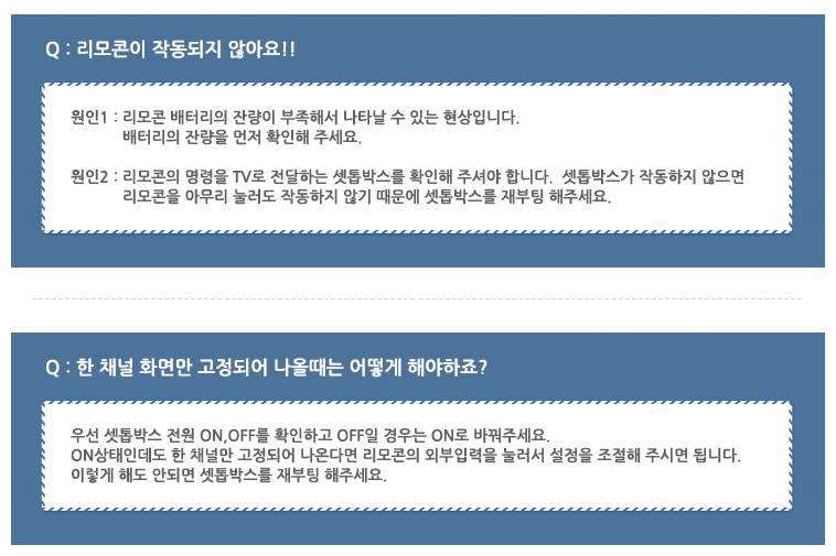 | TV 서비스 | 채널 문의, 셋톱박스 오류, 화질 문제 | 방송 기술센터 |