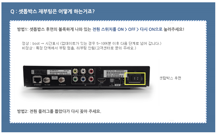 - 셋톱박스 전원을 껐다가 다시 켜고, HDMI 케이블이 올바르게 연결되어 있는지 확인합니다.