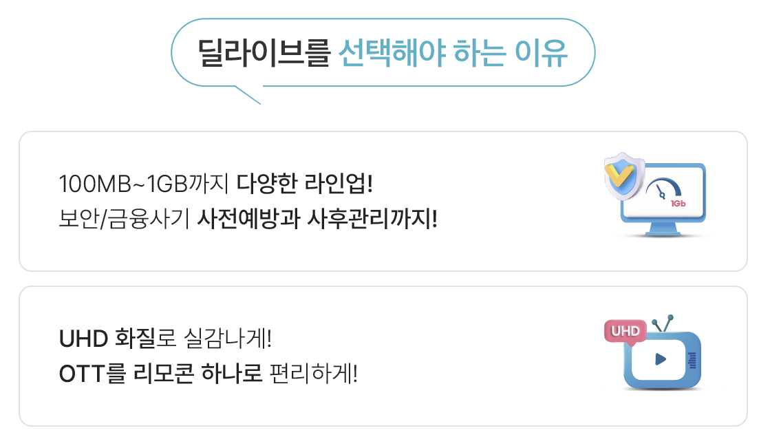 딜라이브는 다양한 상품군을 제공하므로, 상담 내용에 따라 담당 부서가 다릅니다. 주요 서비스를 아래 표로 정리했습니다.