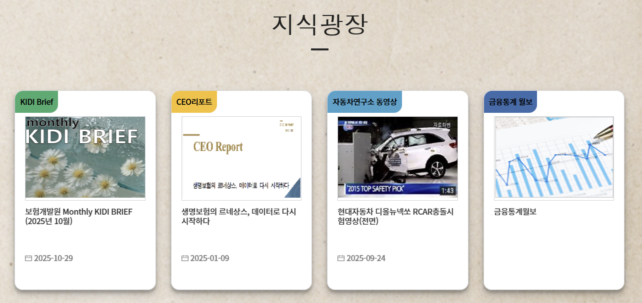 ‘지식광장’은 보험개발원이 발행하는 각종 리포트, 연구자료, 보험산업 통계, 정책 브리핑 자료를 모아둔 공간입니다.