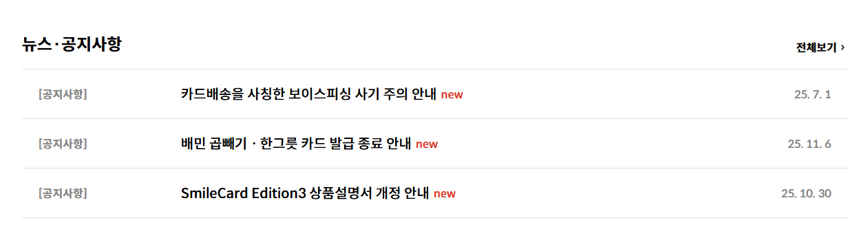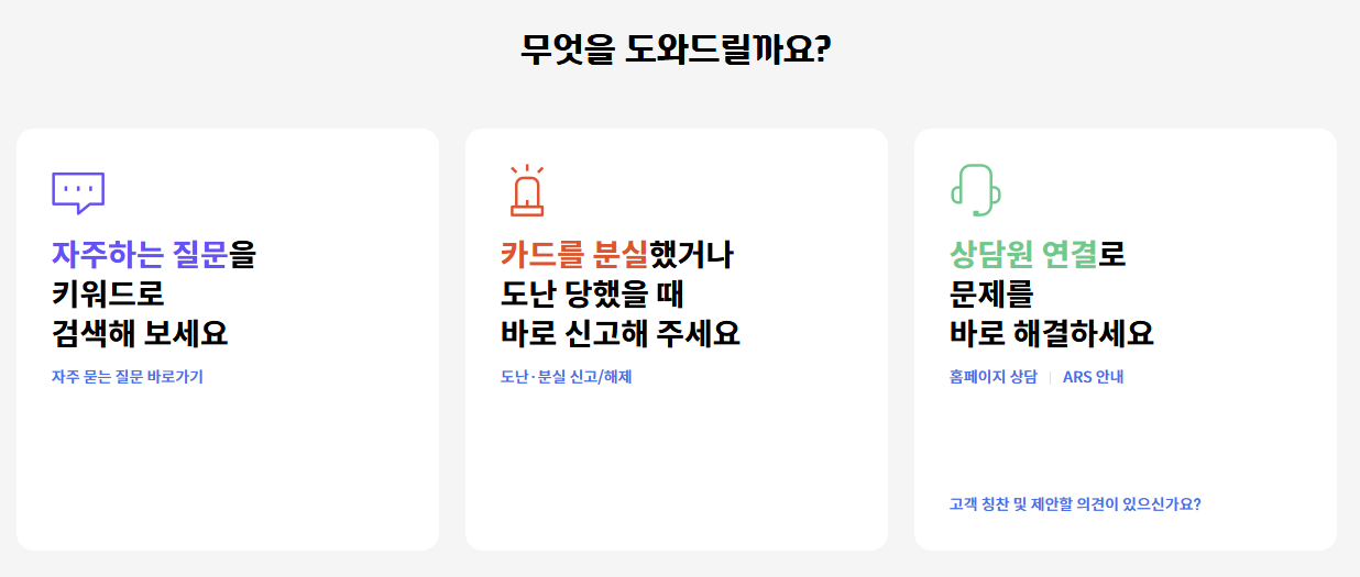 홈페이지 하단에는 고객센터 메뉴가 있습니다. 여기서 자주 묻는 질문(FAQ)을 검색하거나 1:1 문의를 남길 수 있습니다. 또한 챗봇 상담 기능이 도입되어 카드 분실, 결제 오류, 이벤트 문의 등을 실시간으로 해결할 수 있습니다.