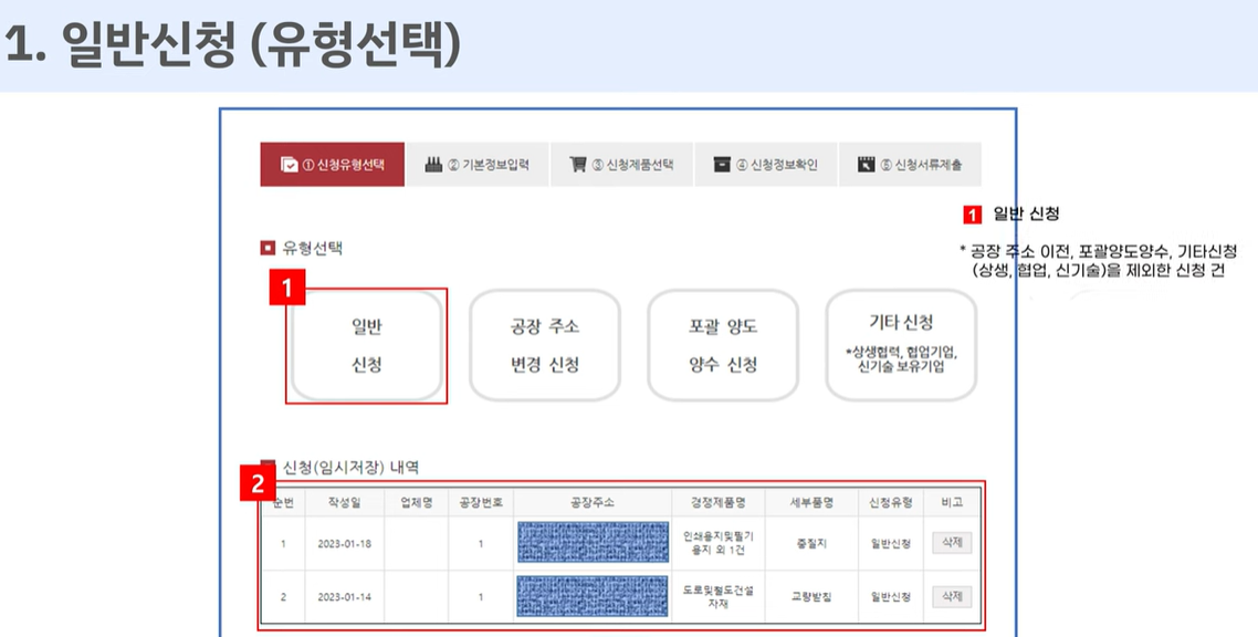 - 사업자등록증 상의 주소와 실제 생산지 주소가 다르면 신청이 불가합니다.