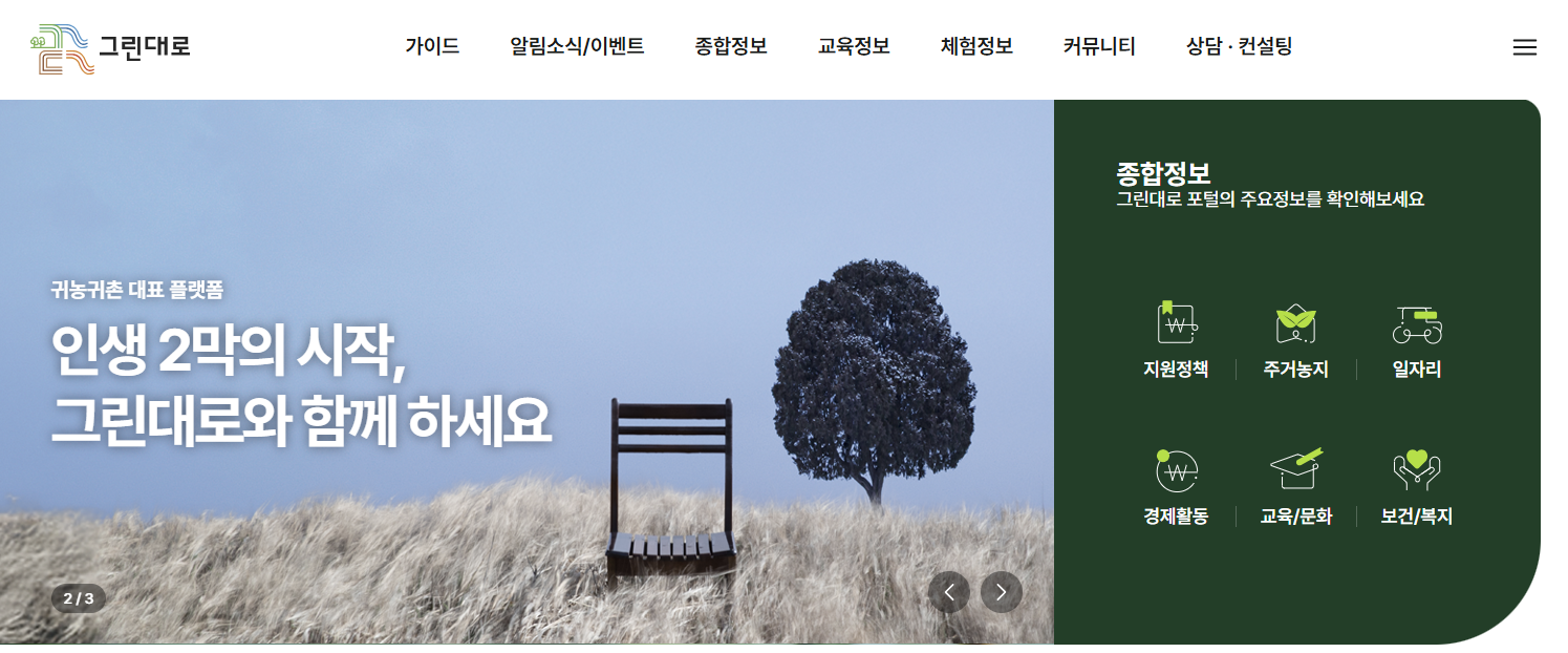 포털 사이트 검색창에 '그린대로'를 검색하여 공식 홈페이지에 접속합니다. 매물 위치나 상세 정보를 확인하기 위해서는 회원가입 후 로그인을 하는 것이 좋습니다. 특히 관심 매물을 저장하거나 상담을 신청하려면 로그인이 필수입니다. - 농촌 생활 정보 메뉴 진입