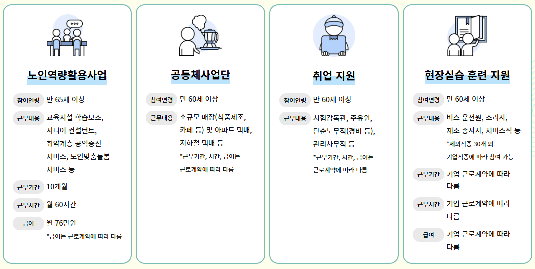 | 취업 지원 | 만 60세 이상 | 시험감독, 주유원, 경비 등 예시, 근로계약에 따라 근무조건 상이 | 공고별 조건 차이가 큼 |