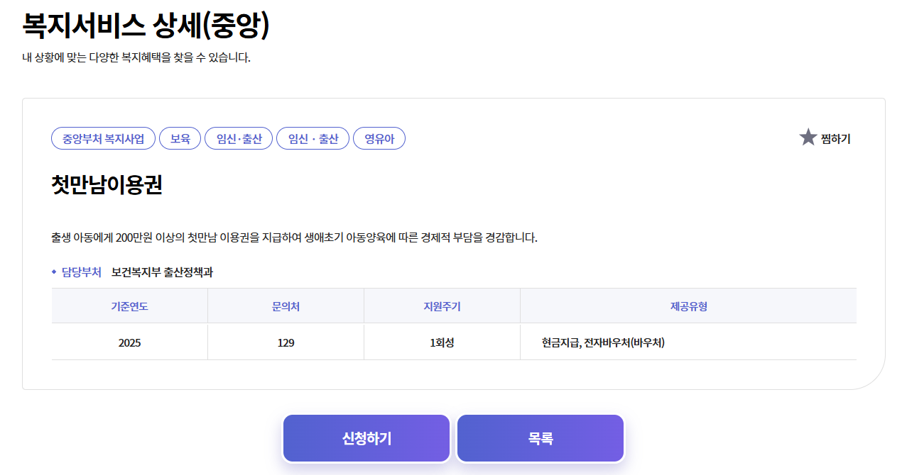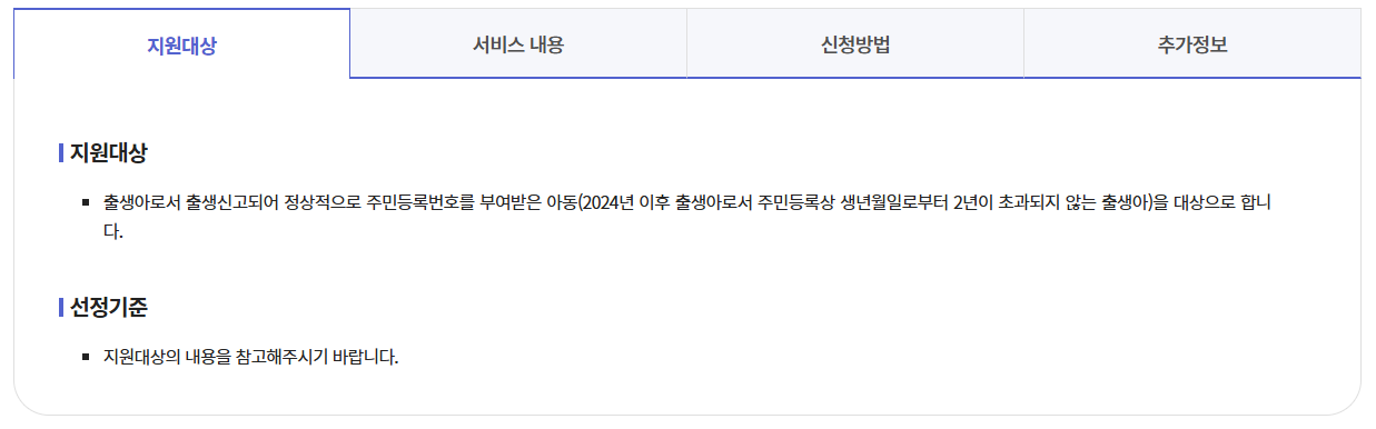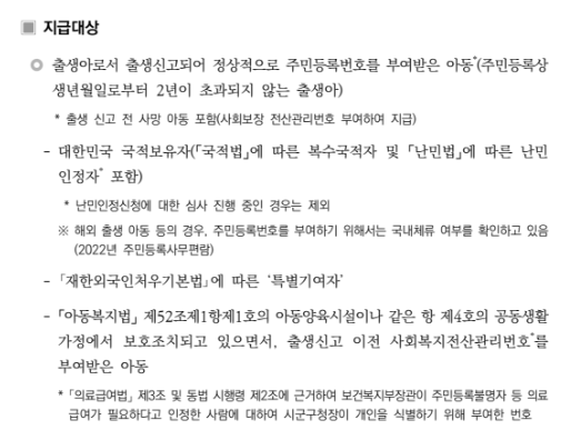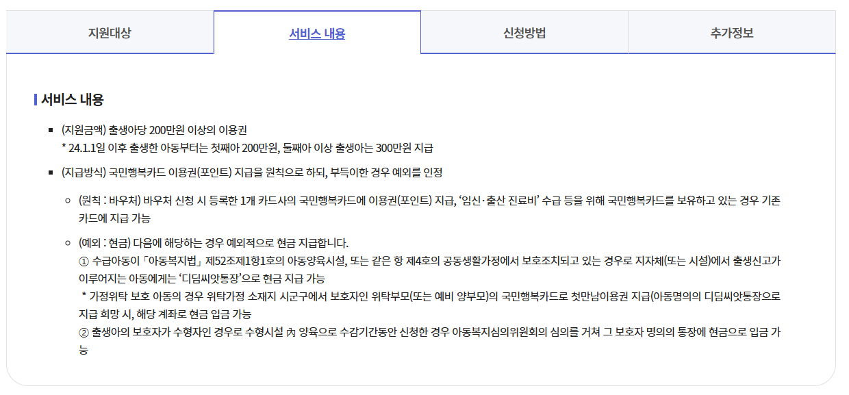 | 기본 성격 | 출생 아동 가정의 초기 양육비 부담을 덜기 위한 바우처 지원 |