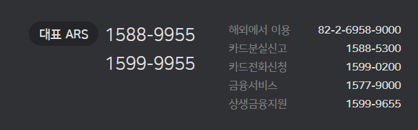 | 대표 고객센터 | 1588-9955 / 1599-9955 | 일반 카드 문의용 대표 ARS |