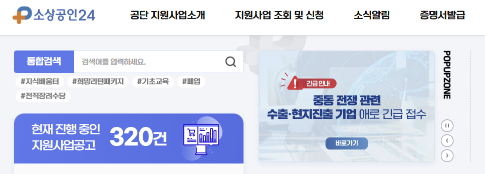 | 실제 신청 | 소상공인24 | 공단 사이트에서 공고 확인 후 신청 플랫폼으로 이동하는 구조 |