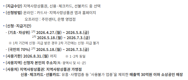 | 사용처 | 지역 내 소상공인 매장 중심 | 대형 유통채널 등은 제한될 수 있음 |
