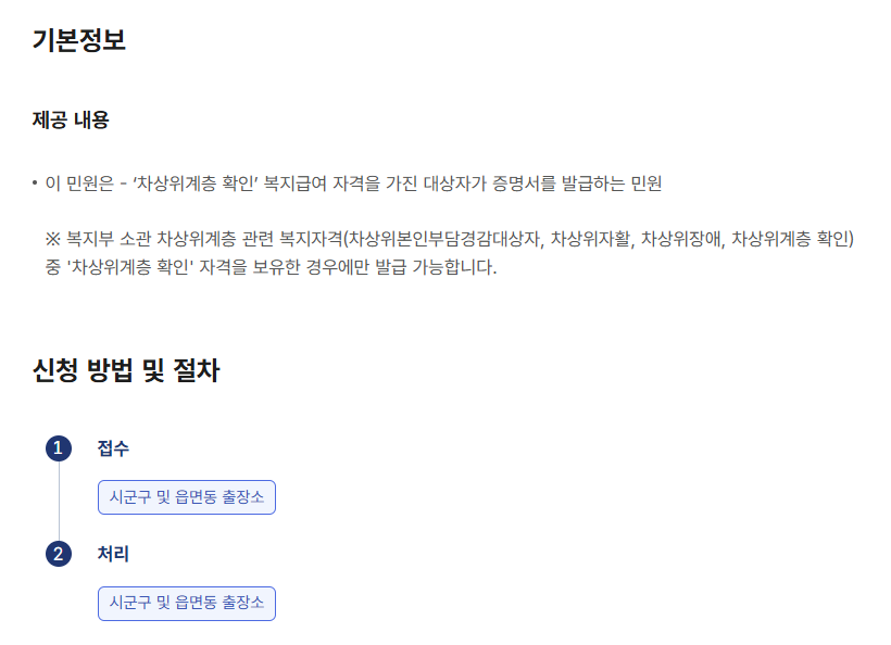 방문 발급은 단순하지만, 민원 창구에서 정확히 요청해야 원하는 서류를 받을 수 있습니다. “차상위 증명서 주세요”라고 하면 다른 종류의 확인서를 안내받을 수 있어, 가능한 한 ‘차상위계층 확인서’라고 정확히 말하는 것이 좋습니다.