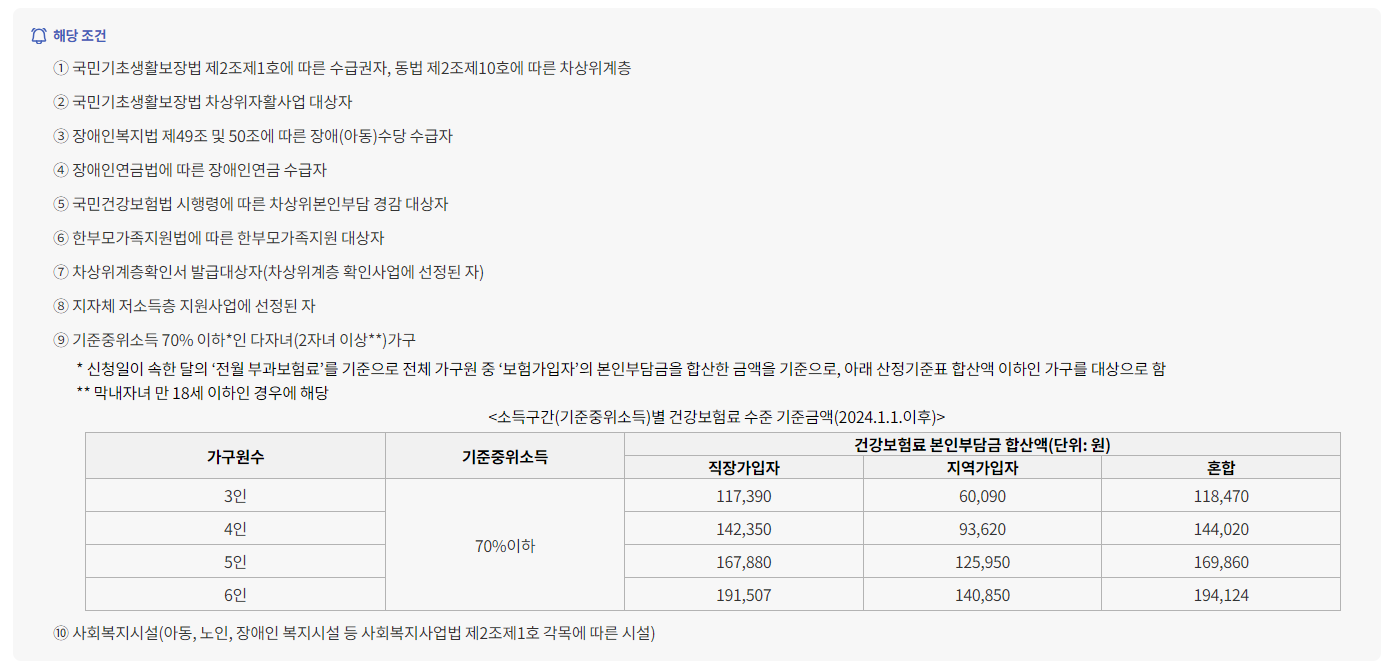 | 기준중위소득 70% 이하 | 주민등록등‧초본, 가족관계증명서, 건강보험료 납부확인서, 건강보험 자격확인서 (납부대상자 및 피부양자 확인) |