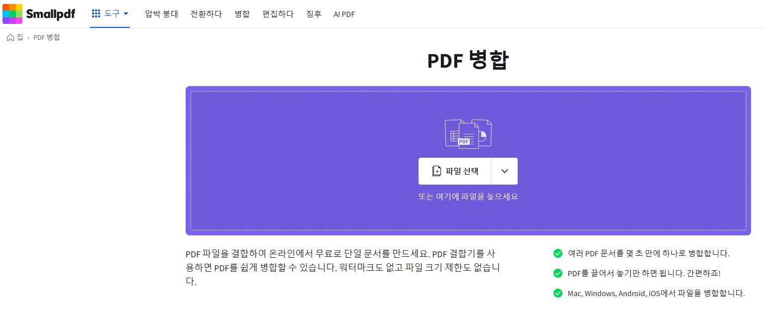 Smallpdf는 무료로 PDF 파일을 합칠 수 있는 웹사이트 중 하나로, 제가 가장 추천드리는 곳이에요. 이 사이트는 한국어도 지원되고, 사용 방법도 아주 간단해요. 파일을 업로드하고 합치기 버튼을 누르기만 하면 끝이에요. 😊