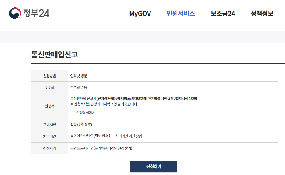 | 통신판매업 신고서 | 필수 | 정부24 또는 민원24에서 작성 |