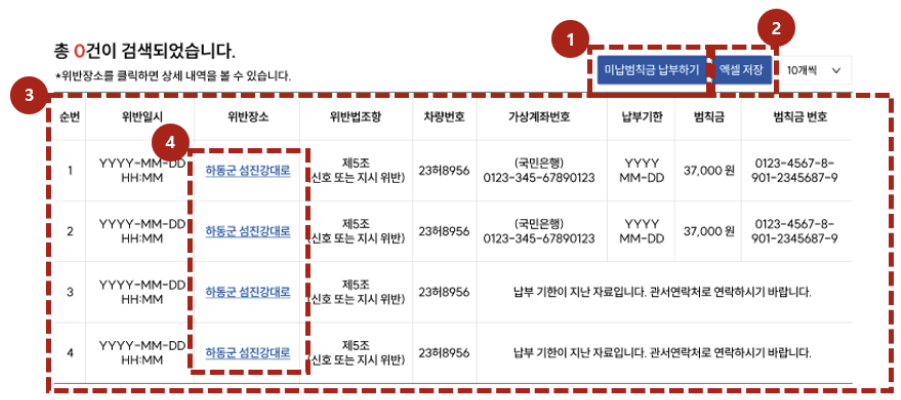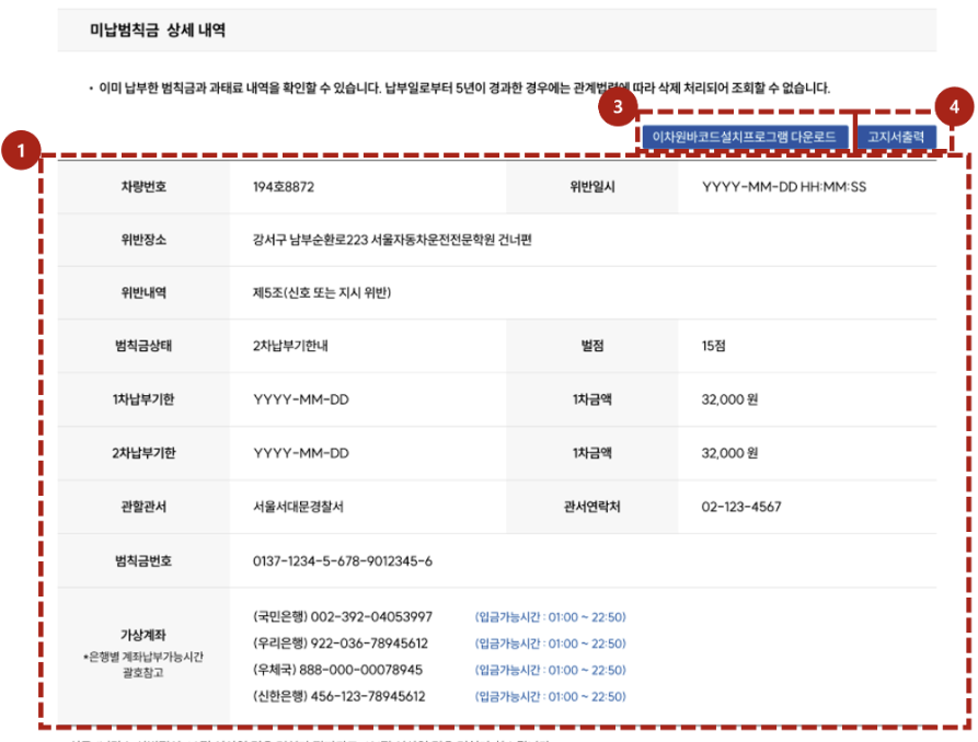 본인 차량의 번호와 주민등록번호를 입력한 후, 교통범칙금 내역을 확인합니다. 여기서 과태료와 범칙금 내역을 함께 조회할 수 있습니다. - 납부 절차 진행