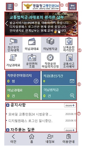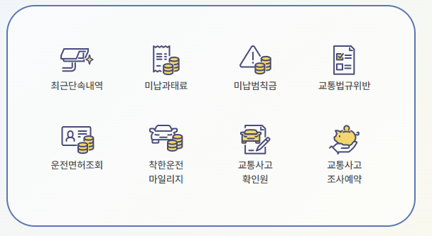 | 범칙금 조회 | 교통 범칙금과 과태료 내역을 조회할 수 있습니다. |