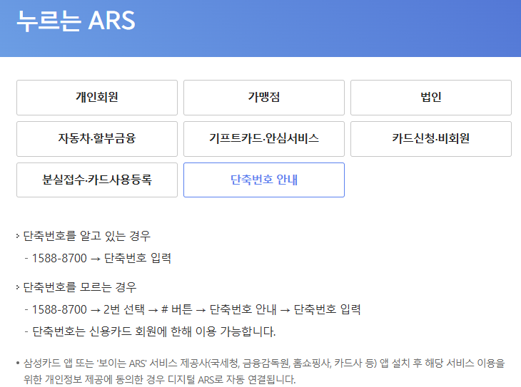 - 상담 목적 선택: ARS 안내에 따라 필요한 서비스(카드 분실, 결제 내역 확인 등)를 선택합니다.