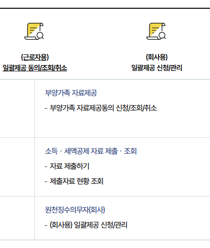 | 부양가족 공제 | 부양가족 자료를 추가하거나 수정할 경우, 공제항목이 자동으로 재계산됨. |