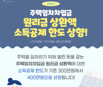 기준시가 3억 원 이하 주택에서 4억 원 이하 주택으로 상향되었으며, 월세 세액 공제는 15%~17%로 조정되었습니다. - 주택임차차입금 원리금 상환액 및 기부금 공제 확대